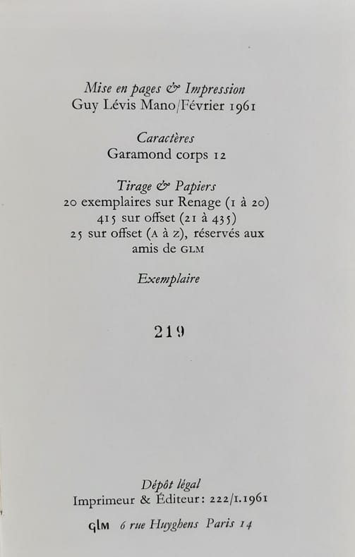 Paris : Guy Lévis Mano (GLM), février 1961. 1 volume (16,5x10,5 cm), 38 pages. Edition originale tirée à 435 exemplaires : 1/415 sur offset. Bon état.