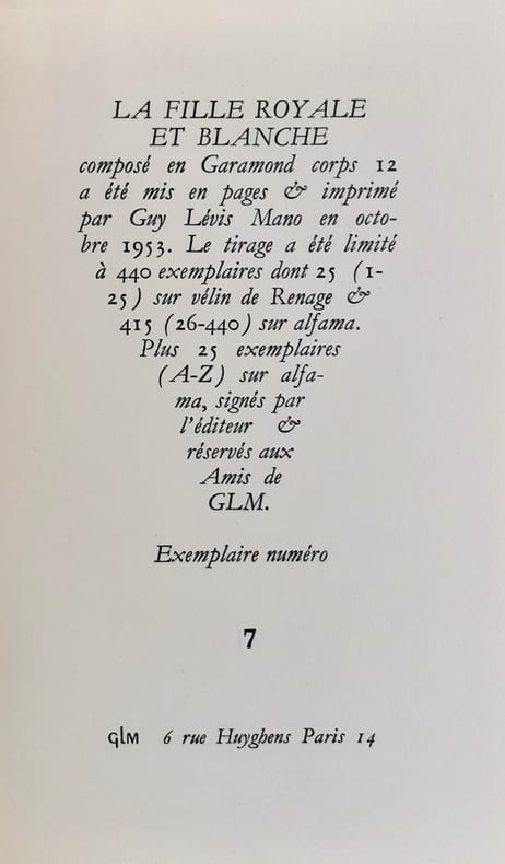 Paris : Guy Lévis Mano (GLM), octobre 1953. 1 volume (16,5x10 cm), 40 pages. Edition originale tirée à 440 exemplaires : 1/25 sur vélin de Renage. Bon état.