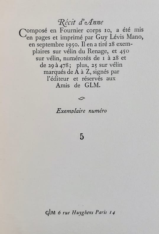 Paris : Guy Lévis Mano (GLM), septembre 1950. 1 volume (16,5x11,4 cm), 50 pages. Edition originale tirée à 503 exemplaires : 1/28 sur vélin de Renage. Bon état.
