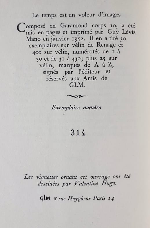 Paris : Guy Lévis Mano (GLM), janvier 1952. 1 volume (16,4x11 cm), 40 pages. Edition originale tirée à 455 exemplaires : 1/430 sur vélin. Bon état.