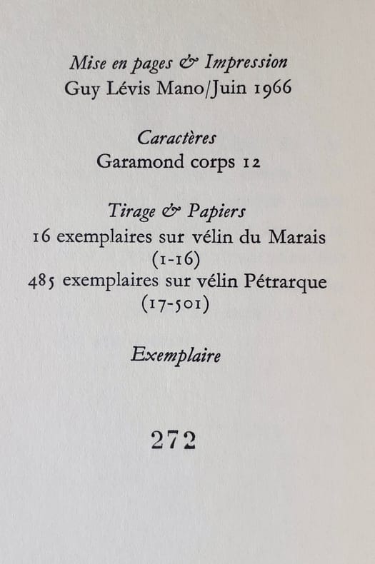 Paris : Guy Lévis Mano (GLM), juin 1966. 1 volume (19,3x9,8 cm), 36 pages. Edition originale tirée à 501 exemplaires : 1/485 sur vélin. Bon état.