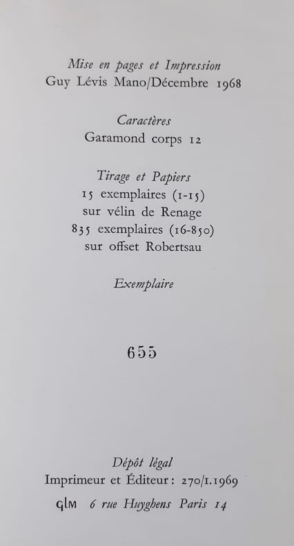 Paris : Guy Lévis Mano (GLM), décembre 1968. 1 volume (19,4x11,5 cm), 95 pages. Edition originale tirée à 850 exemplaires : 1/835 sur offset. Bon état.