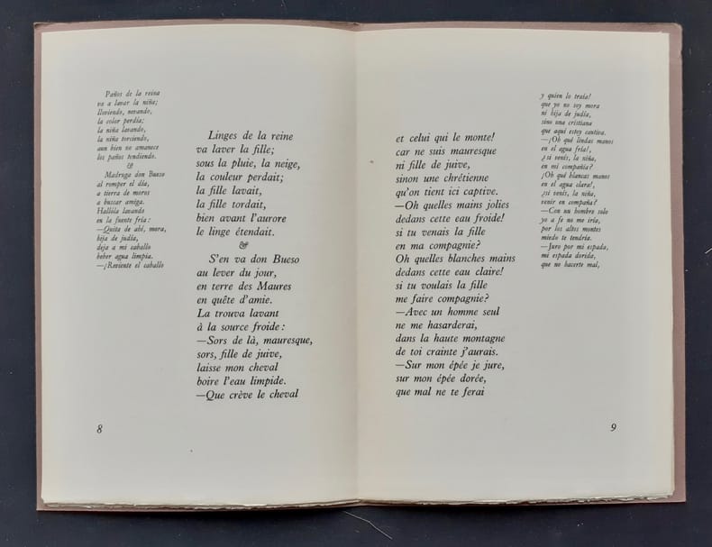 Edition bilingue : version espagnole de Ramon Menéndez Pidal traduite par Guy lévis Mano. Paris : Guy Lévis Mano (GLM), janvier 1954. 1 volume en feuilles (28,8x19 cm) sous couverture imprimée, 16 pages. Edition originale tirée à 435 exemplaires : 1/410 sur vélin du Marais. Bon état.