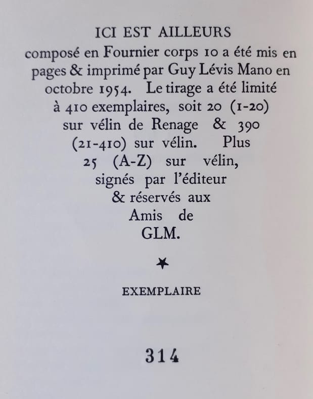 Paris : Guy Lévis Mano (GLM), octobre 1954. Un volume broché (19x11,4 cm), 66 pages. Edition originale limitée à 435 exemplaires : 1/390 sur vélin. Bon état.