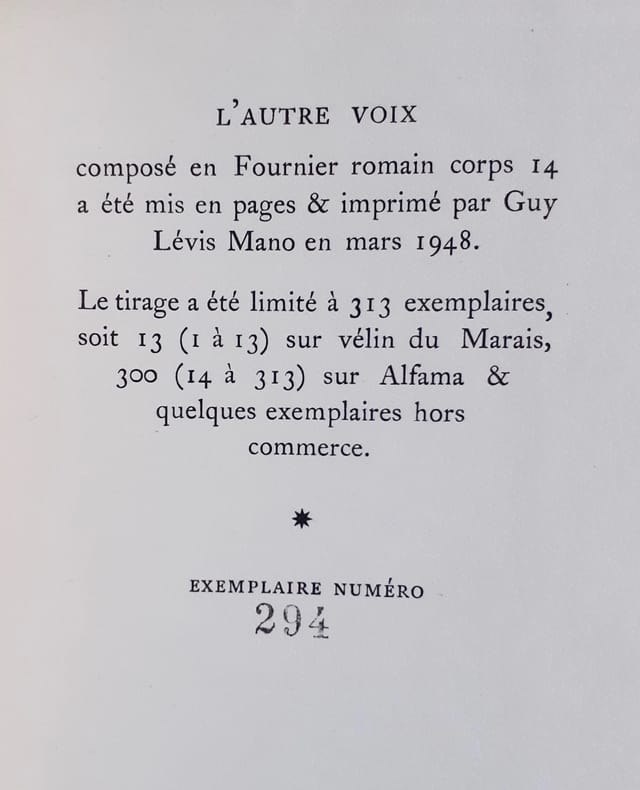 Paris : Guy Lévis Mano (GLM), mars 1948. Un volume broché (16,5x11 cm), 36 pages. Edition originale limitée à 313 exemplaires : 1/300 numérotés sur alfa.