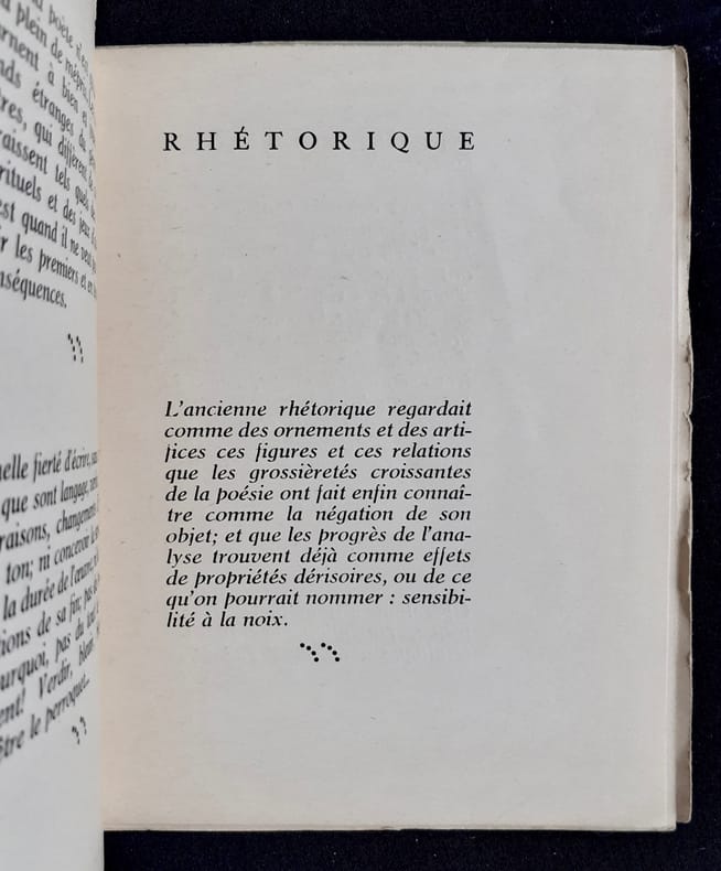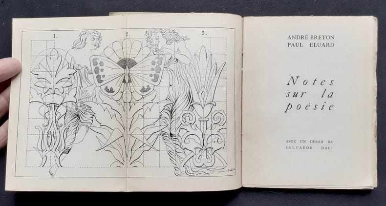 Edition GLM, Edition originale achevée d' imprimer le 5 mai 1936. Tirage limité à 100 exemplaires sur Vélin (le nôtre n'est pas justifié) après 15 sur Japon numérotés. Ces réflexions des deux poètes sont ornés d' un dessin en N & B sur dépliant de Salvador DALI en frontispice. Non paginé (46 pages).