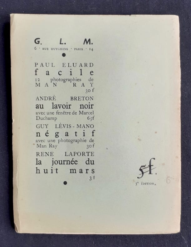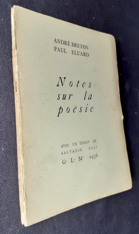 Paris : Guy Lévis Mano (GLM), mai 1936. Un volume broché (16,8x12,8 cm), (44) pages. Avec un dessin reproduit au trais de Salvador Dali sur une planche dépliante en frontispice. Edition originale sur papier vélin hors commerce sous couverture verte (cf. Antoine Coron, catalogue GLM, Bibliothèque Nationale, 1981, n°97) outre 15 exemplaires sur japon et 100 exemplaires sur vélin. Fausse mention de troisième édition sur le second plat. Dos défraichi avec 2 manques sinon bon état.