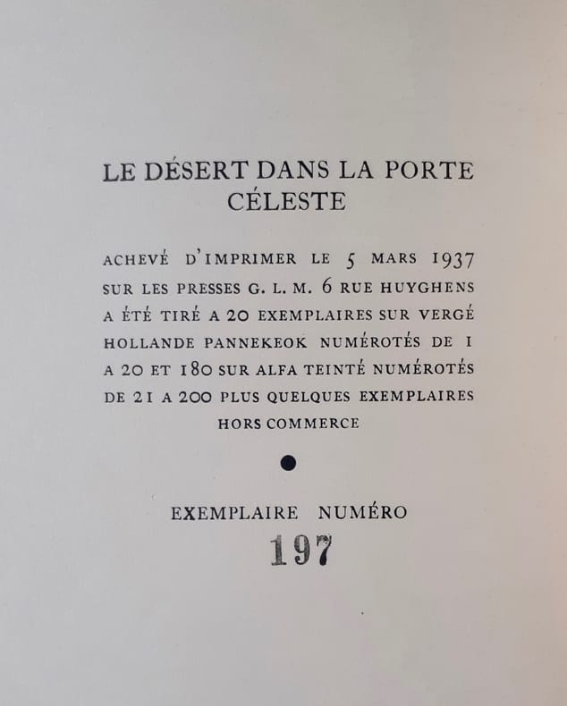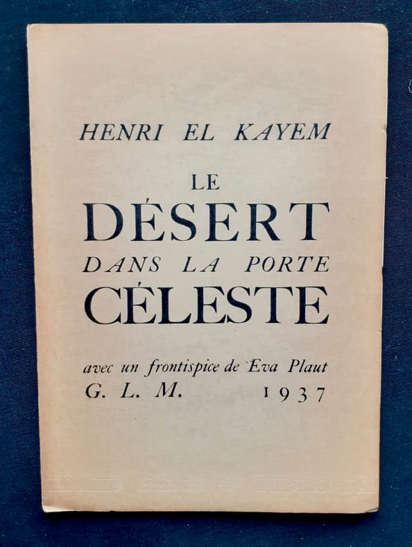 Paris GLM 1937 1 vol. broché in-8, broché, non paginé. Édition originale ornée d'un dessin en frontispice par Eva Pault. Premier recueil de l'auteur (1912-2000), médecin d'origine égyptienne proche des surréalistes, connu aussi sous le nom d'Henri Lecaye. Tirage limité à 200 exemplaires, celui-ci un de 20 de tête numérotés sur vergé Hollande Pannekoek [Coron, GLM, 142]. En parfaite condition.