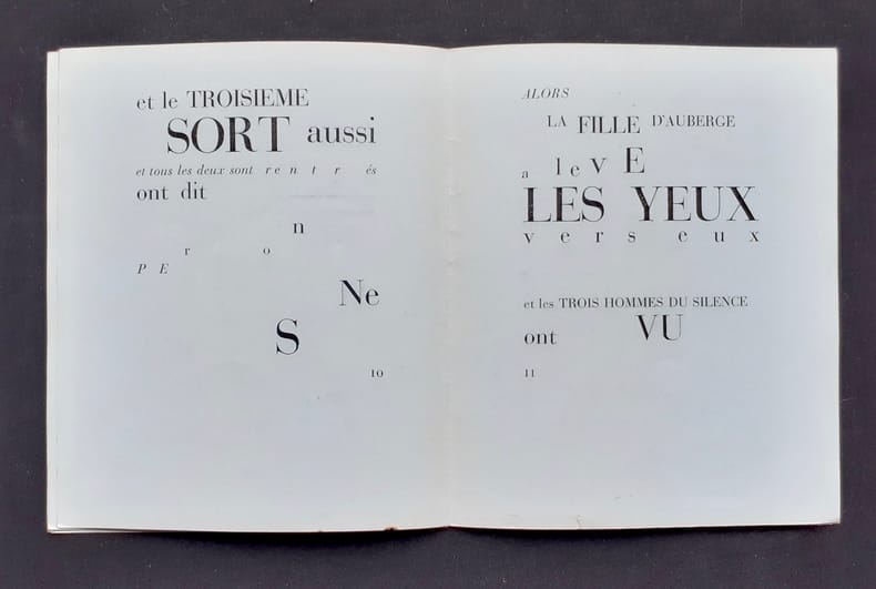 Paris, GLM, 1933. 18,5 x 15 cm, 12 pp. Plaquette en feuilles, sous portefeuille de canson noir. Édition originale de ce bel exercice "typoétique", tiré uniquement à 135 exemplaires, celui-ci numéroté sur couché azur. Portefeuille usagé, un rabat détaché, sinon bon état.