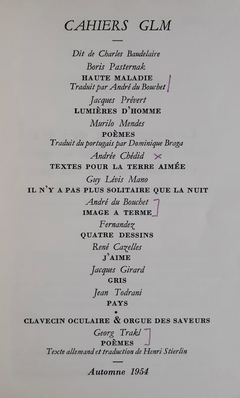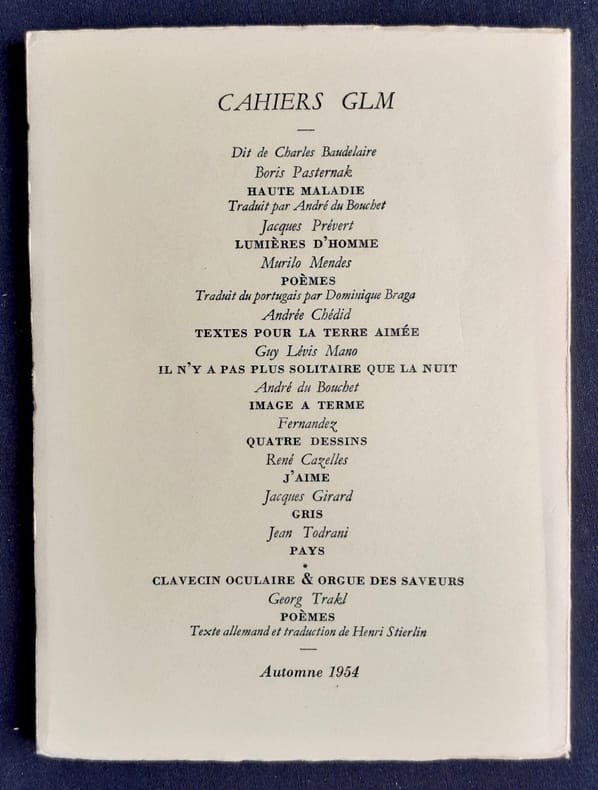 CAHIERS GLM. 2e série complète, du n° 1 (été 1954) au n° 4 (automne 1956). Chacun des quatre volumes est 1/300 numérotés sur vélin. // Très bon état. // Textes de : Maurice Blanchard, André du Bouchet, André Frénaud, René Char, André Pieyre de Mandiargues, Jacques Prévert, Jean Todrani, Georg Trakl, Federico García Lorca, Jacques Dupin, Franz Hellens, Yves Bonnefoy, Pierre Torreilles. Dessins de : Joan Miró, Fernandez, Jacques Villon, Alberto Giacometti.
