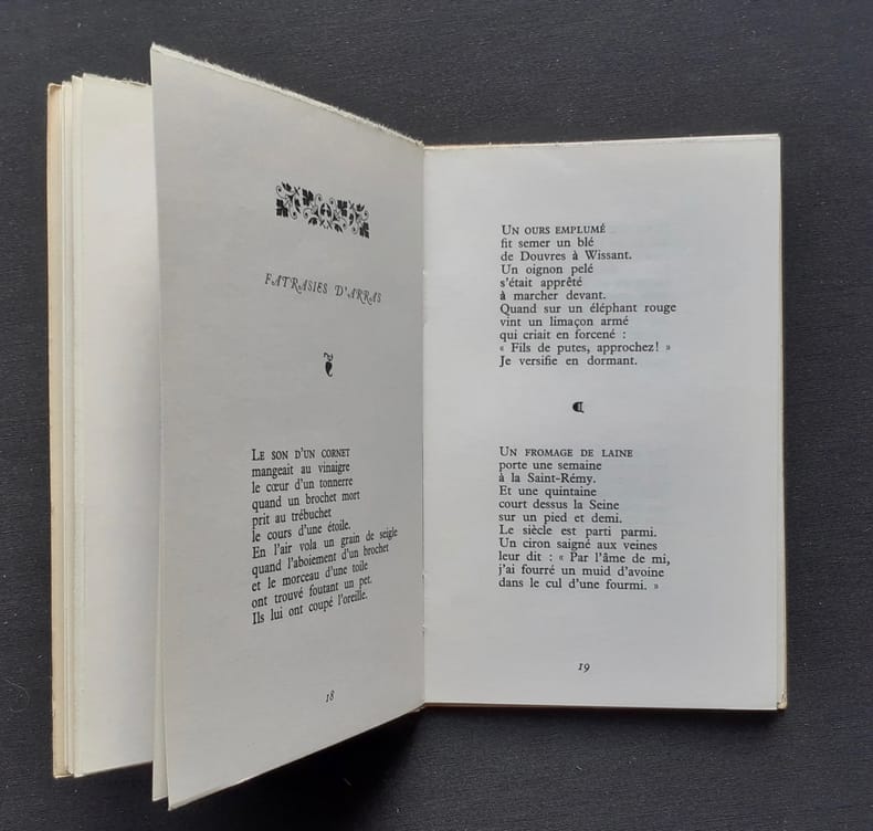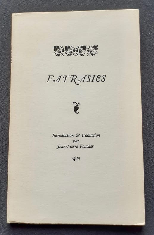 Introduction et traduction de Jean-Pierre Foucher. Paris : Guy Lévis Mano (GLM), mars 1964 - un volume broché (16,6x10,4 cm), 72 pages. Edition originale tirée à 1050 exemplaires numérotés : 1/1000 sur offset. Bon état. Recueil des fatrasies d'Arras, de Beaumanoir, Watriquet, Jean Régnier, Jean Molinet et un fatras anonyme.