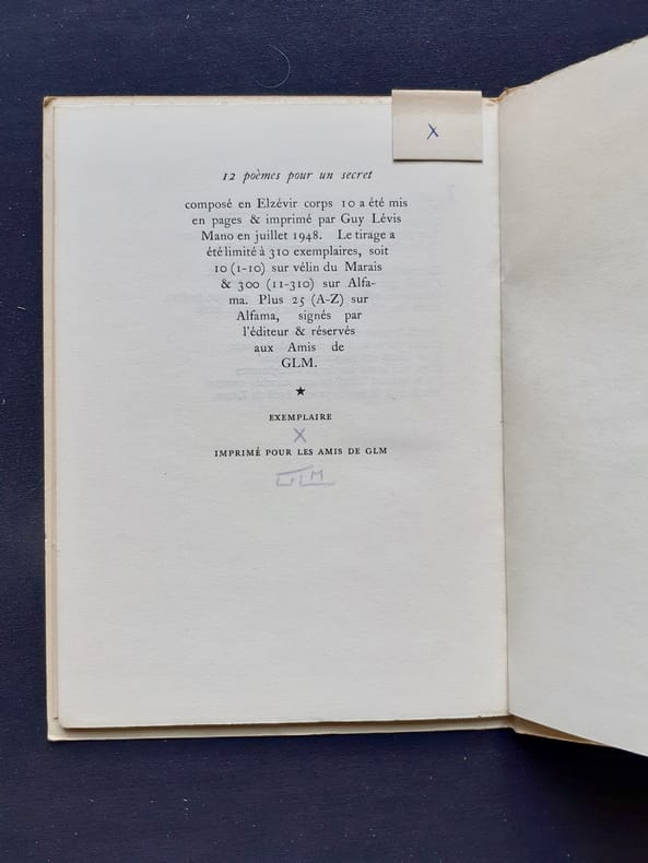 Paris : Guy Lévis Mano (GLM), juillet 1948 - un volume broché (19,9x14,3 cm), 38 pages. Edition originale tirée à 335 exemplaires numérotés : 1/25 sur alfama réservés aux Amis de GLM et signé par l'éditeur. Bon état.