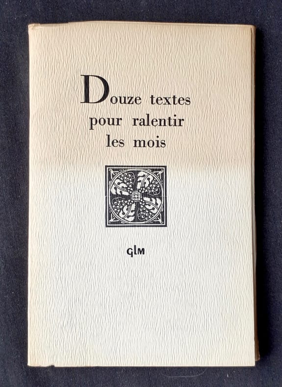 Editions Guy Lévis Mano - GLM 1954. Chemise in-12 broché, au format 10,5 x 16,5 cm. Couverture avec titre imprimé en noir et petite vignette illustrée. Dos carré. Contient 12 cartes sur papier de Flandres de diverses couleurs, avec des textes divers : La Bible, Livre des morts, Voyageur Chérubinique d'Angélus Silésius, Sonnet CXLVI de Shakespeare, Un poème Sumérien, Les Roses de Saadi de Marceline Desbordes-Valmore, Artémis de Gérard de Nerval, O beaus yeus bruns de Louise Labé, Heures de Tristan Corbière, etc. Tirage unique à 220 exemplaires numérotés sur flandre, tous hors commerce, réservés à Guy Lévis Mano pour son plaisir et à l'attention de ses amis et compagnons. Le nôtre porte le n° 200, et sous la mention " Exemplaire imprimé spécialement pour ", Guy Lévis Mano à écrit le nom de l'écrivain et poète Luc Estang. Superbe état général. Edition originale.
