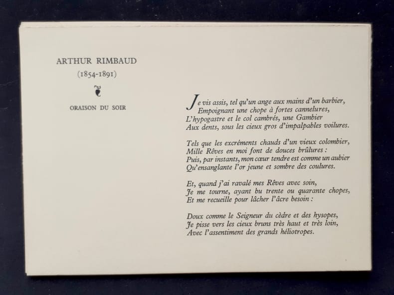 Paris : Guy Lévis Mano (GLM), novembre 1965 - un volume en feuilles (19,5x13,7 cm) sous chemise imprimée, 15 feuilles libres non numérotées imprimées au recto. Edition originale tirée à 225 exemplaires numérotés sur vélin de Renage, tous hors commerce. Le nôtre imprimé pour La librairie Franklin. Extraits choisis par Guy Lévis Mano de Joachim du Bellay à Mallarmé. Première de couverture jaunie sur une partie, sinon bon état.