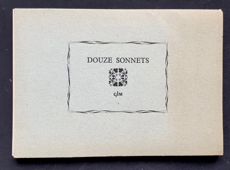 Paris, GLM 1965, 195x140mm, en feuilles sous couverture imprimée. Ces douze sonnets ont été choisis et imprimés par Guy Lévis Mano en cette fin de l’an 1965 pour son plaisir et à l’intention de ses amis et compagnons de travail. Tirage limité à 225 exemplaires sur vélin de Renage, n° 35 imprimé pour Gisèle Réal.