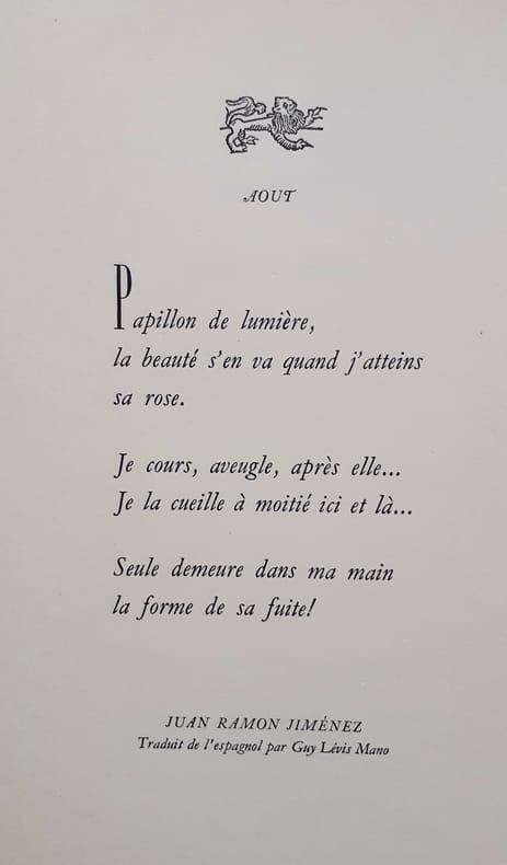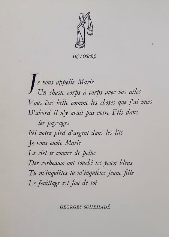 Chaque poème est orné d'une vignette astrologique gravée sur bois. Coron 422. Un des 225 ex. num. sur vélin de Renage, tous hors commerce, celui-ci imprimé pour une traductrice zurichoise. Poèmes de : Guillaume de Machault, Christine de Pisan, François Villon, une chanson espagnole anonyme traduite par Guy Lévis Mano, Arthur Rimbaud, René Char, Paul Éluard, Juan Ramon Jiménez traduit par Guy Lévis Mano, Rainer Maria Rilke, Georges Shehadé, André Chedid, Pierre Jean Jouve. Exemplaire en parfait état.