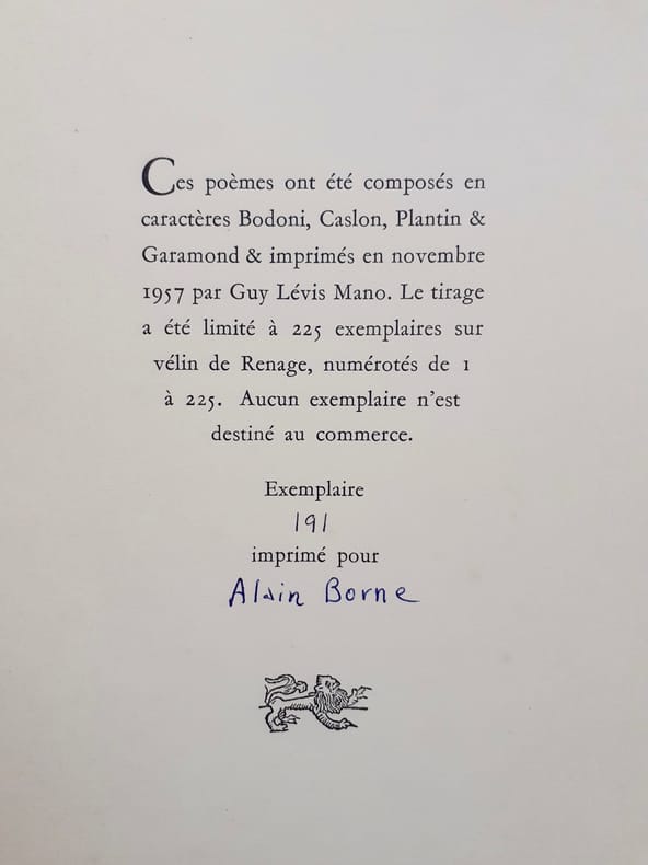 Tirage à 225 exemplaires sur vélin de Renage, tous hors commerce, n°60 imprimé pour Margot Nyst, relieuse française qui s'installa à Bruxelles en 1949. [422].