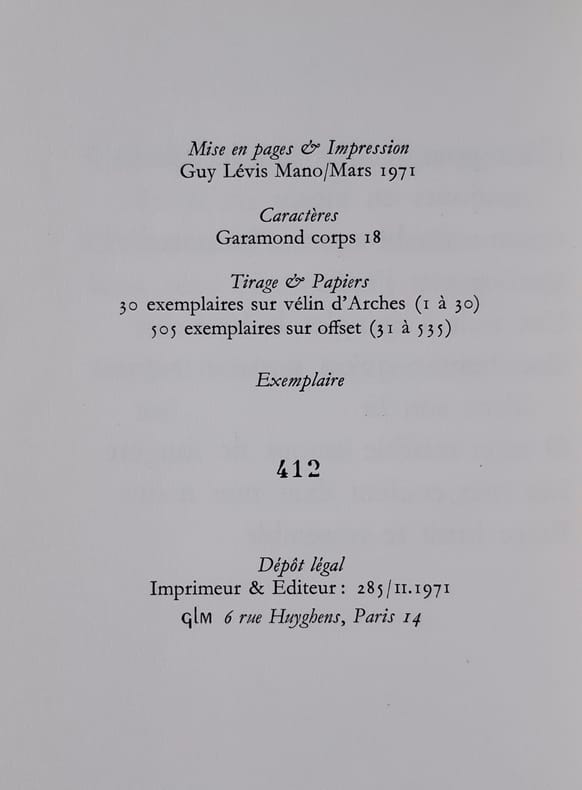 Paris : Guy Lévis Mano (GLM), mars 1971 - un volume broché (19,5x14,5 cm), 34 pages. Edition originale tirée à 535 exemplaires numérotés : 1/505 sur offset. Bon état.