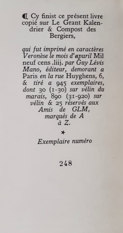 Paris : Guy Lévis Mano (GLM), avril 1963 - un volume broché (14,5x9,8 cm), 48 pages. Avec 14 gravures anciennes reproduites au trais en bandeaux et page de titre. Edition originale tirée à 945 exemplaires numérotés : 1/890 sur vélin. Bon état.