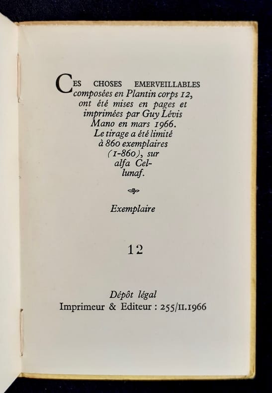 Paris : Guy lévis Mano (GLM), mars 1966. 1 volume broché (12,3x8,4 cm), (34) pages. Edition originale tirée à 860 exemplaires sur alfa Cellunaf. Bon état.