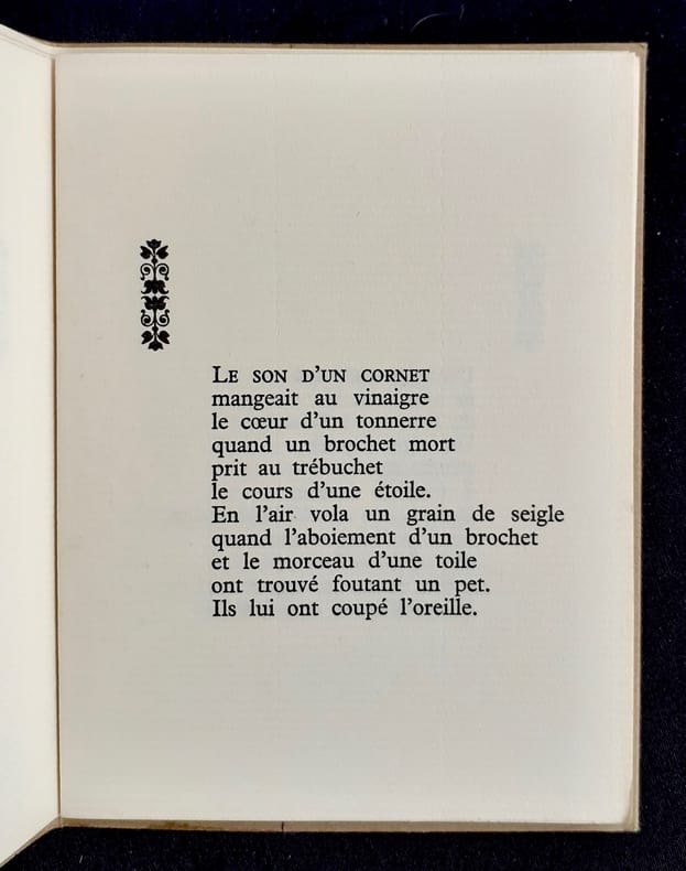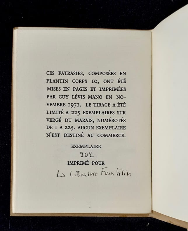 Paris : Guy lévis Mano (GLM), novembre 1971. 1 volume en feuilles (12,8x9,5 cm) sous chemise à rabats imprimée, (24) pages. Edition originale tirée à 225 exemplaires sur vergé du Marais, tous hors commerce. Bon état.