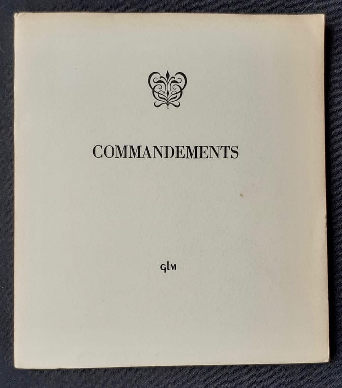 Paris : Guy Lévis Mano (GLM), novembre 1955 - un volume en feuilles (19x7,4 cm) sous chemise blanche imprimée à rabats, 16 feuilles libres non numérotées imprimées au recto. Un dessin de Valentine Hugo reproduit au trais. Edition originale tirée à 220 exemplaires numérotés, tous hors commerce. Commandements extraits de "La Bible des docteurs de Louvain" (1578). Bon état.