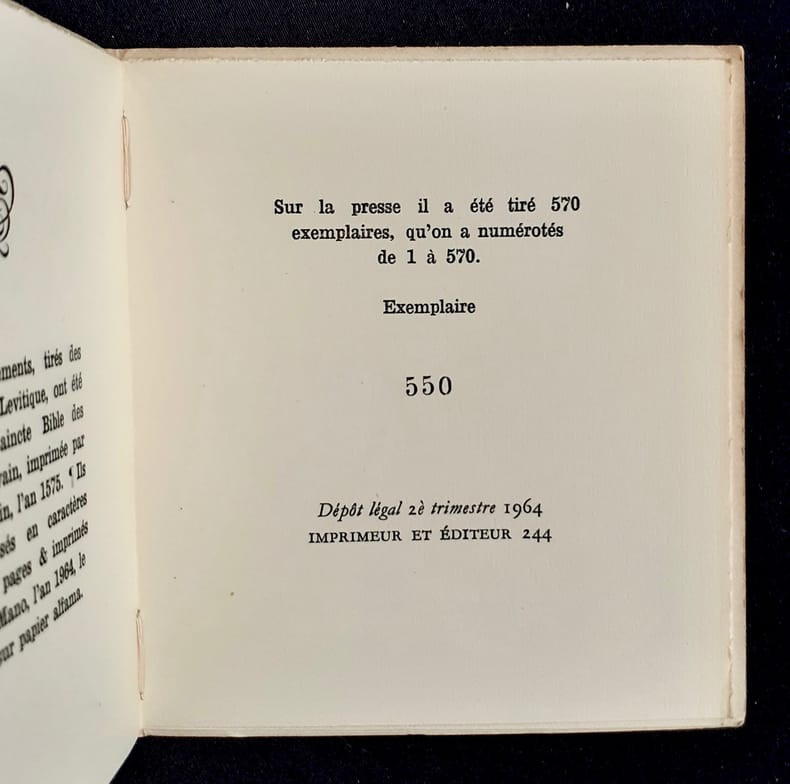 Paris : Guy lévis Mano (GLM), avril 1964. 1 volume broché (12,4x10,8 cm), 30 pages. Edition originale tirée à 570 exemplaires numérotés sur alfama. Extraits de "La Saincte Bible des Docteurs de Louvain". Bon état.