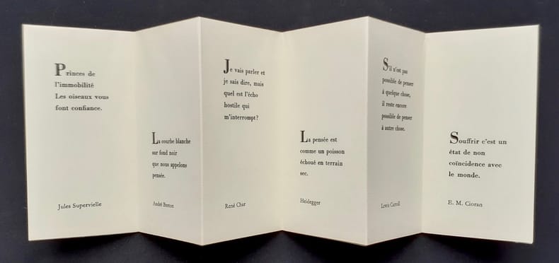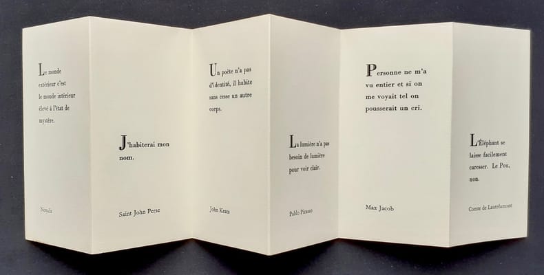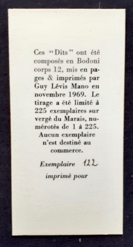 Paris : Guy lévis Mano (GLM), novembre 1969. 1 volume broché (12,9x6,5 cm), (10) pages (6 formant d'une feuille pliée, un paravent de 12 pages imprimées). Edition originale tirée à 225 exemplaires numérotés sur vergé du Marais, tous hors commerce. Textes choisis par Guy Lévis Mano parmis les grands noms de la poésie française. Bon état.