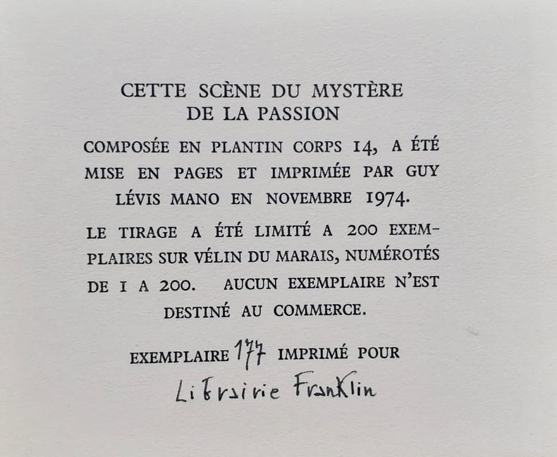Paris: Guy Lévis Mano (GLM), novembre 1974. Un volume en feuilles (10x12,5 cm) cm, (16) pages. Edition tirée à 200 exemplaires numérotés sur vélin du Marais, tous hors commerce. Notre exemplaire a été imprimé pour la Librairie Franklin. Bon état.