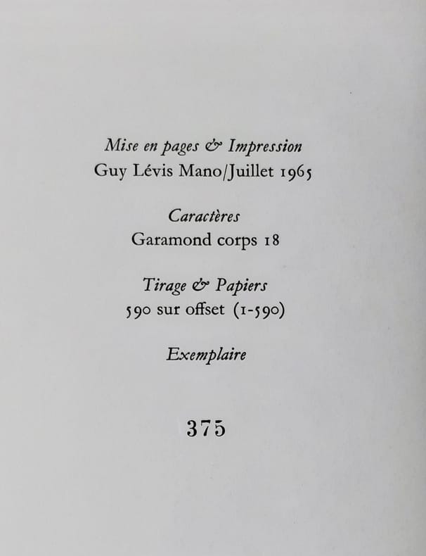 Guy Lévis Mano, 1965. En feuilles, couverture gris perle imprimée. 19,5 x 11,3 cm.