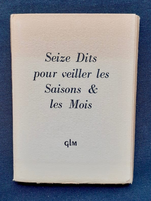 Paris: Guy Lévis Mano (GLM), avril 1953. Un volume en feuilles (11,1x8 cm) sous chemise à rabats imprimée, 22 feuilles libres non numérotées. Edition tirée à 225 exemplaires numérotés sur vélin du Marais, tous hors comerce. Choix de Guy Lévis Mano : René Char, Victor Hugo, Nietzsche, Ibsen, Proverbes, espagnol, africai, persan, etc. Bon état.