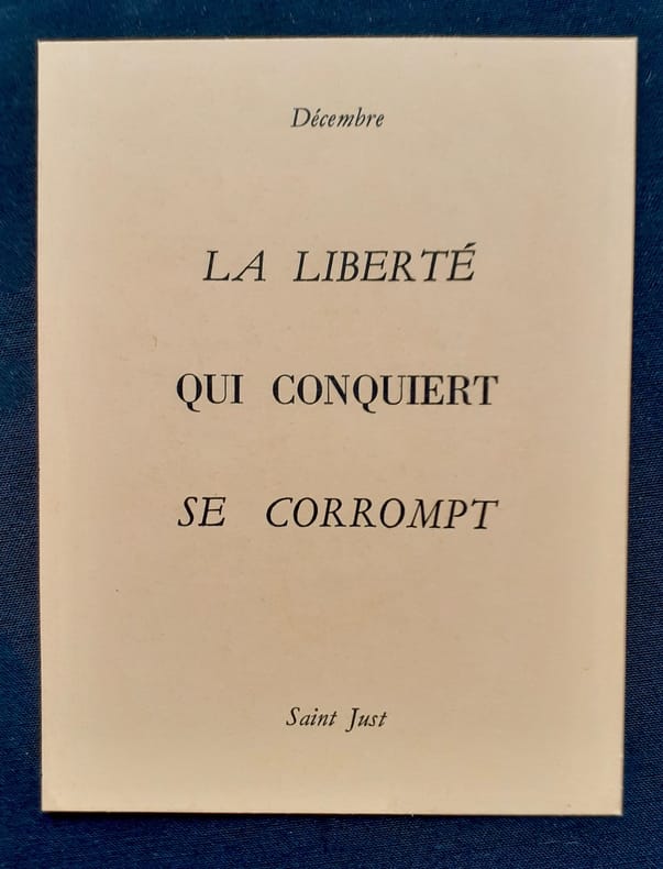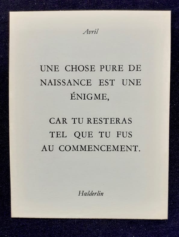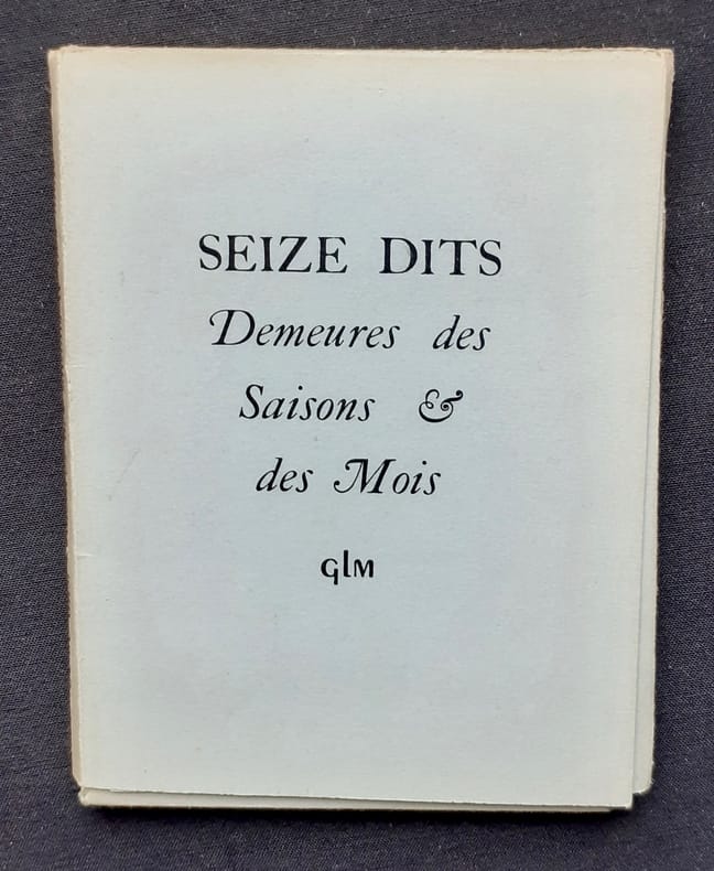 Paris: Guy Lévis Mano (GLM), décembre 1952. Un volume en feuilles (11,1x8 cm) sous chemise à rabats imprimée, 20 feuilles libres non numérotées. Edition tirée à 200 exemplaires numérotés sur cartes de Flandres de couleurs, tous hors commerce. Exemplaire imprimé pour le poète Alain Borne. Choix de Guy Lévis Mano : René Char, Rembrandt, Antonio Porchia, Héraclite, Hoelderlin, Nietzsche,etc. Bon état.
