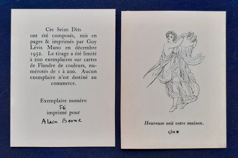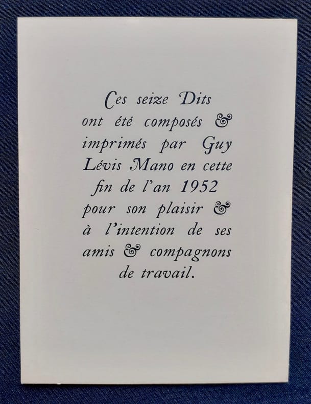 De 1923 à 1974 Guy Lévis Mano (1904-1980), ouvrier typographe et poète a imprimé et édité plus de 500 livres de poésie d'auteurs français et étrangers allant du surréalisme à Garcia Lorca, ou de Louise Labé à Andrée Chedid. "Le style typographique de G.L.M., qui fera rechercher ses livres dans l'avenir comme les plus représentatifs de notre époque, est parvenu à ce même équilibre heureux entre les audaces modernes et la plus sûre tradition."(Albert Béguin, 1949).