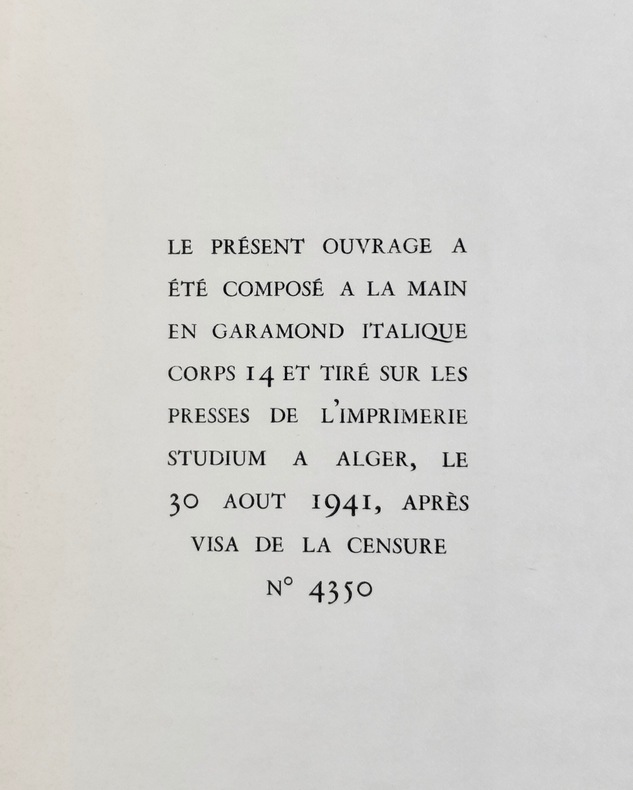 Alger, E. Charlot, Alger, E. Charlot1945 ; in-12, broché. 64 pp., 1 f. de justificationNouvelle édition, imprimée à Paris après la Libération. Edmond Charlot avait publié le Romancero gitan en août 1941 dans la collection “Poésie et théâtre” dirigée par Albert Camus. C’est la première traduction intégrale du texte. Camus a écrit à Jean Grenier “... je dirige pour Charlot une collection “Poésie et théâtre” dont le premier volume vient de paraître. C’est le Romancero gitan de Lorca (...) J’ai encore quelques beaux textes à faire paraître dans cette collection.” En février 1942 “Charlot se retrouve trois semaines en détention. Vichy le considérant communiste... Après quelques jours à Barberousse, la prison d’Alger, il est mis en résidence surveillée à Charon, près d’Orléansville”. Puche. Edmond Charlot éditeur (pp. 24-25).