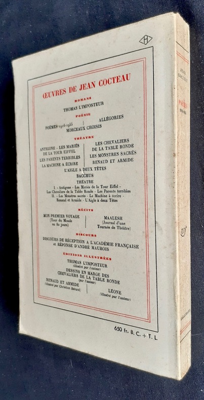 Paris, Gallimard, (11 juin) 1956 1 vol. (120 x 185 mm) de 231 p., [3] f. et 1 f. Broché. Édition originale, avec mention de "5e édition". Envoi signé : « à mon Jeannot [Jean Marais] à mon soleil, Jean ».