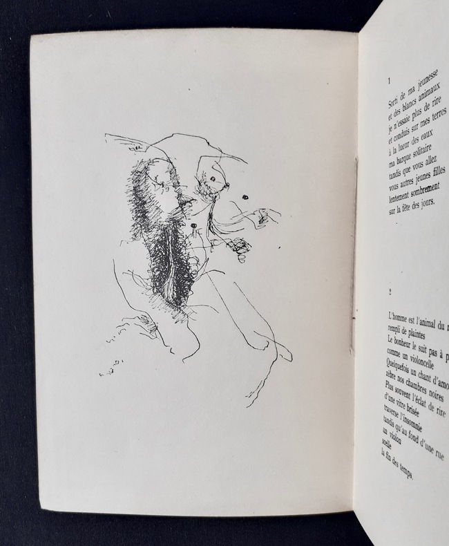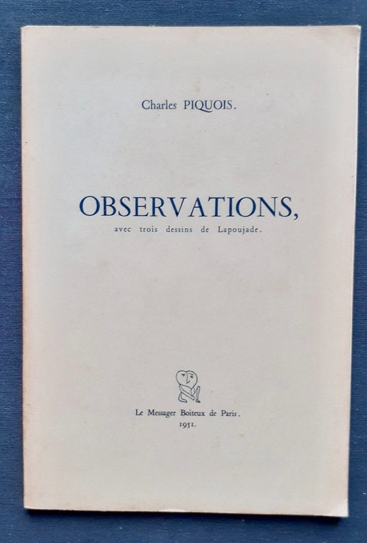 Paris : A l'enseigne du Messager Boiteux de Paris (Collection "d'un certain prix"), 1951. Un volume broché (19,8x13,5 cm), (24) pages avec trois dessins hors texte de Robert Lapoujade. Edition originale tirée à 500 exemplaires numérotés à la main : 1/ 475 exemplaires sur papier d'édition Norvège. Bon état (exemplaire non coupé).