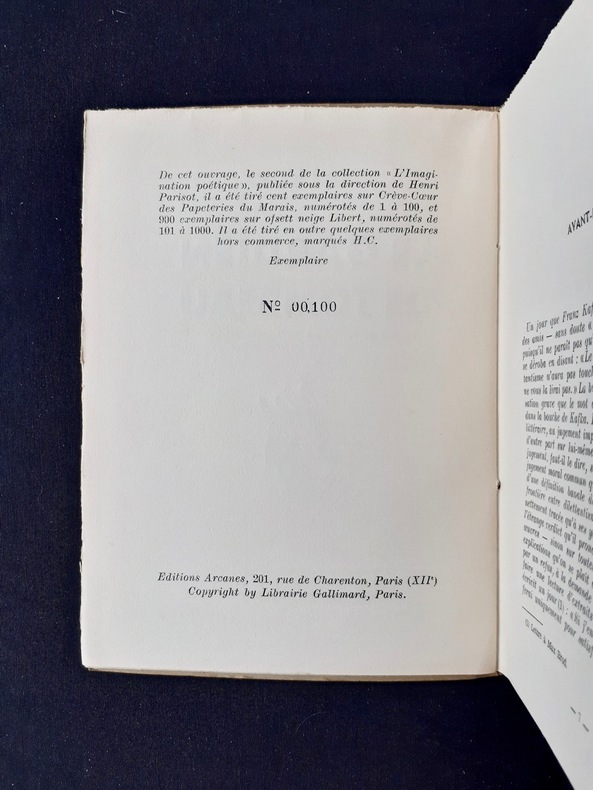 Traduit de l'allemand par Marthe Robert. Editions Arcanes, (collection " L'imagination Poétique " dirigée par Henri Parisot), 1953. Un volume 19,5x14cm, broché, sous couverture imprimée en deux tons. 44 pages. Avec un avant-propos de Marthe Robert et notes sur Le Gardien de tombeau, par Max Brod. Edition originale de la traduction. Tirage à 1000 exemplaires. Un des 100 exemplaires du tirage de tête numérotés sur Crève-coeur des Papeteries du Marais (n°100). Exemplaire en bon état, non coupé.