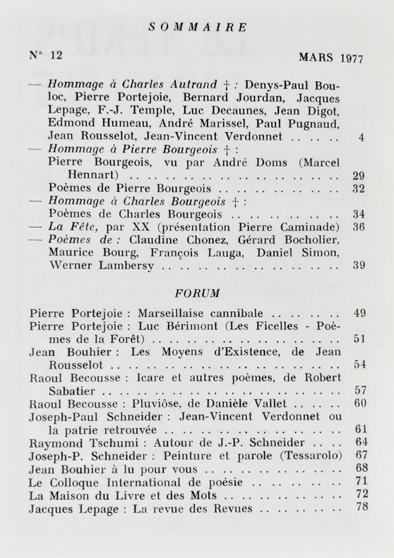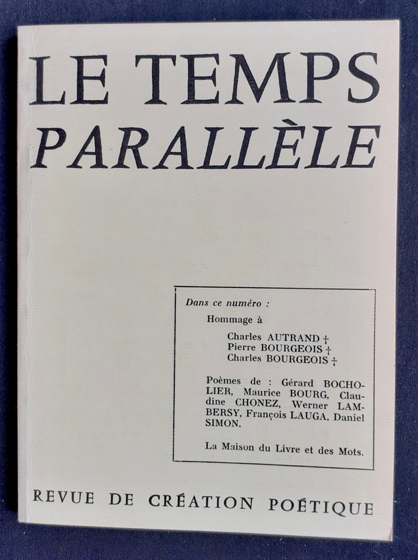 Eygalières, directeur: Pierre Portejoie. Un volume 18,3x13,8cm broché de 64 pages. Bon état. Ce numéro comprend trois hommages: à Charles Autrand, Pierre Bourgeois et Charles Bourgeois. Animé par Pierre Portejoie, Le Temps parallèle compte 35 livraisons parus de 1974 à 1983, suivies en 1984, par la revue de poésie Les Nouvelles parallèles (13 numéros jusqu’en 1991).