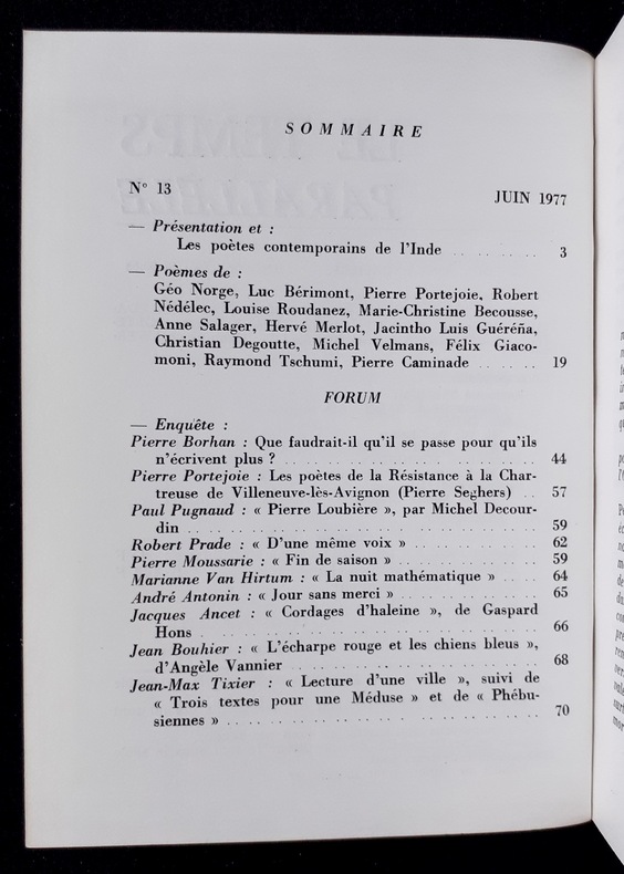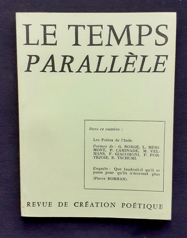 Eygalières, directeur: Pierre Portejoie. Un volume 18,3x13,8cm broché de 64 pages. Bon état. Ce numéro comprend une présentation de la poésie indienne contemporaine. Animé par Pierre Portejoie, Le Temps parallèle compte 35 livraisons parus de 1974 à 1983, suivies en 1984, par la revue de poésie Les Nouvelles parallèles (13 numéros jusqu’en 1991).