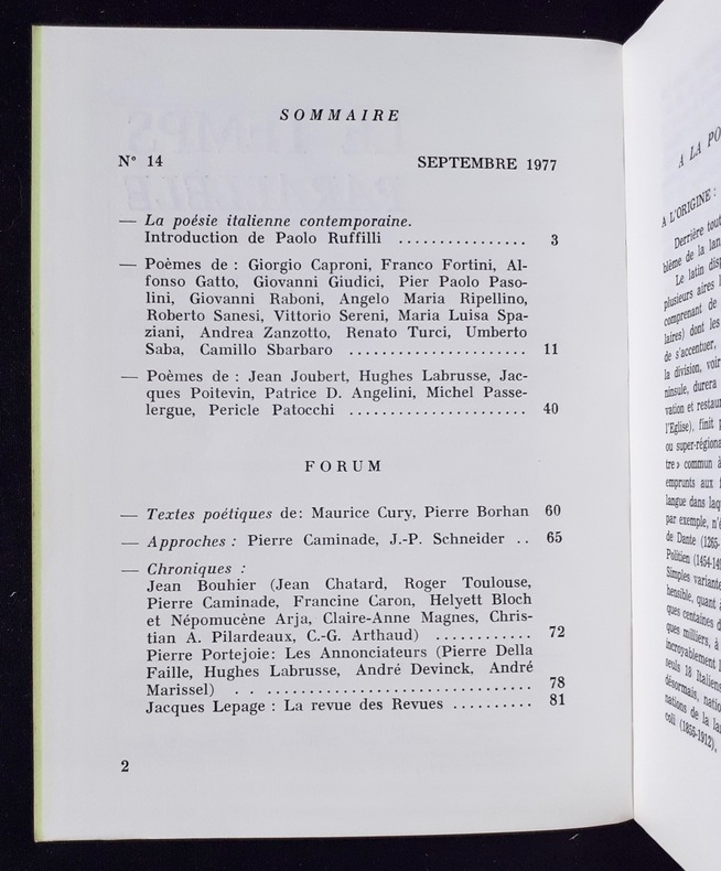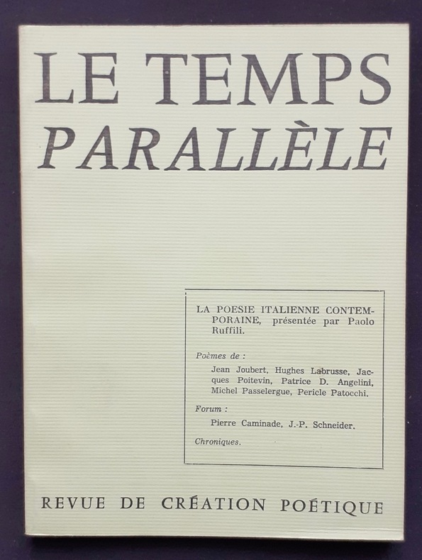 Eygalières, directeur: Pierre Portejoie. Un volume 18,3x13,8cm broché de 88 pages. Comprend un dossier consacré à la poésie italienne contemporaine. Bon état. Animé par Pierre Portejoie, Le Temps parallèle compte 35 livraisons parus de 1974 à 1983, suivies en 1984, par la revue de poésie Les Nouvelles parallèles (13 numéros jusqu’en 1991).