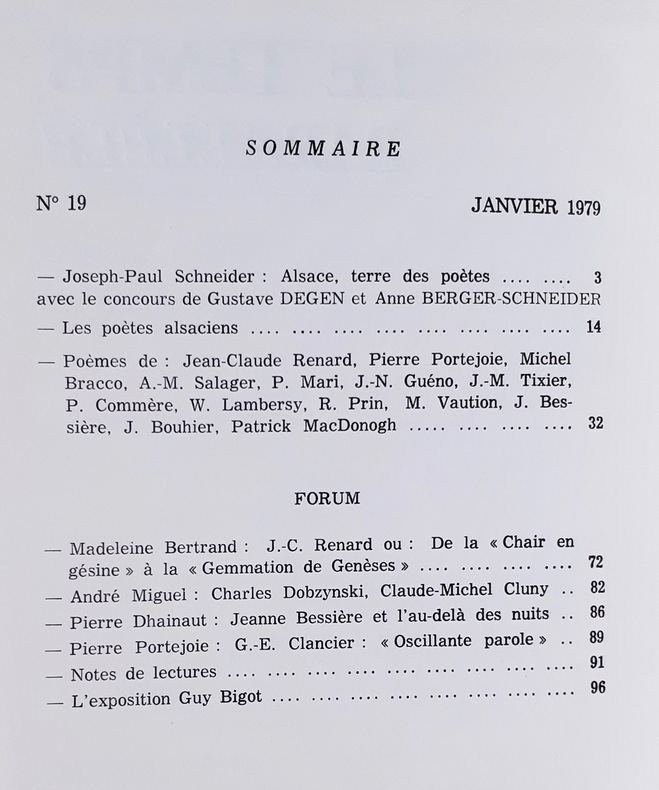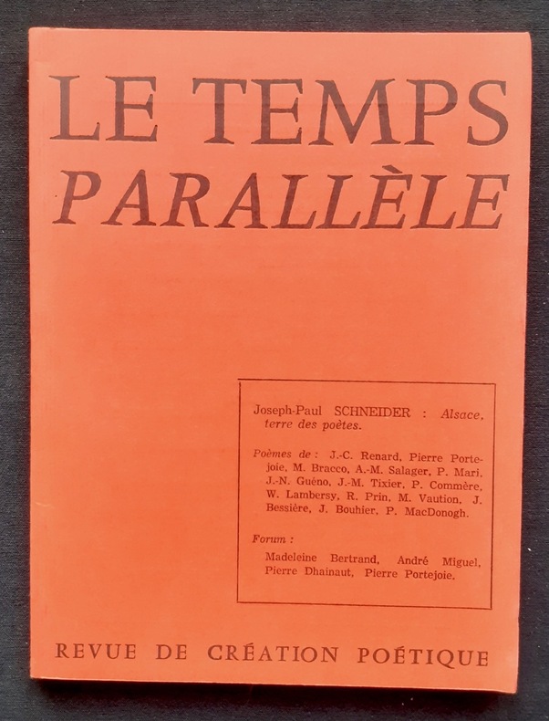 Eygalières, directeur: Pierre Portejoie. Un volume 18,3x13,8cm broché de 98 pages. Comprend un dossier consacré aux poètes en Alsace. Bon état. Animé par Pierre Portejoie, Le Temps parallèle compte 35 livraisons parus de 1974 à 1983, suivies en 1984, par la revue de poésie Les Nouvelles parallèles (13 numéros jusqu’en 1991).