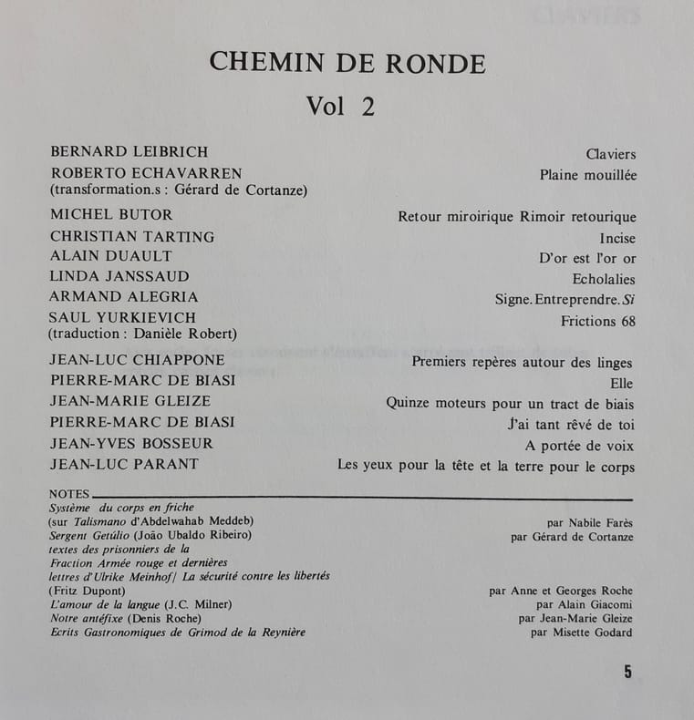 Revue de poésie qui comptera 5 numéros en 5 livraisons publiés entre 1977 et 1984. En 2010, Christian Tarting et Danièle Robert créeront la maison d'édition Chemin de ronde.