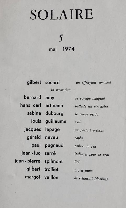 Revue de poésie active de mai 1973 à octobre 1983 en 31 numéros et 22 livraisons, animée par René Daillie, alors attaché culturel à l’Ambassade de France au Caire. «Solaire s’adresse à ceux pour qui la poésie ne saurait être une industrie comme une autre, ni un aspect de la linguistique expérimentale, mais d’abord un rapport de tous les instants avec la vie et l’univers, une raison.»