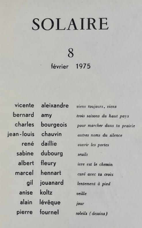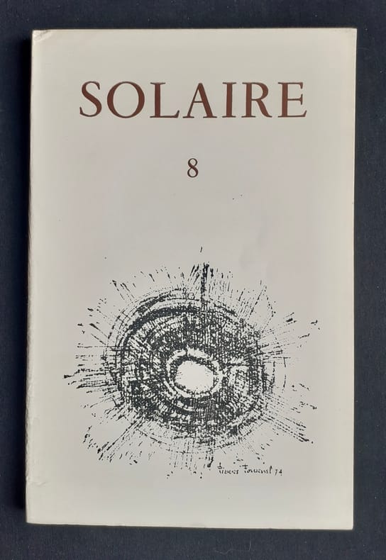 Revue de poésie active de mai 1973 à octobre 1983 en 31 numéros et 22 livraisons, animée par René Daillie, alors attaché culturel à l’Ambassade de France au Caire. «Solaire s’adresse à ceux pour qui la poésie ne saurait être une industrie comme une autre, ni un aspect de la linguistique expérimentale, mais d’abord un rapport de tous les instants avec la vie et l’univers, une raison.»