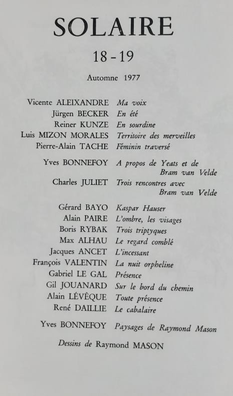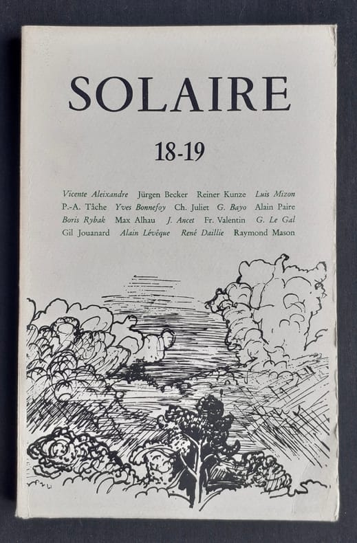 SOLAIRE. " Revue trimestrielle de poésie ". // N° 18-19. Automne 1977. Vicente Aleixandre, Jürgen Becker, Reiner Kunze, Luis Mizon Morales, Pierre-Alain Tache, Yves Bonnefoy (sur Bram van Velde), Charles Juliet (sur Bram van Velde), Gérard Bayo, Alain Paire, Gil Jouanard, René Daillie Dessins de Raymond Masson. Très propre.