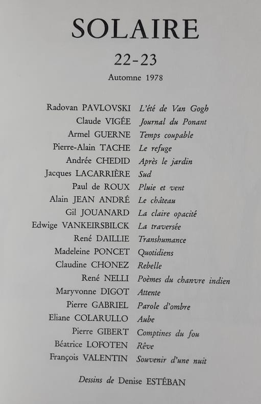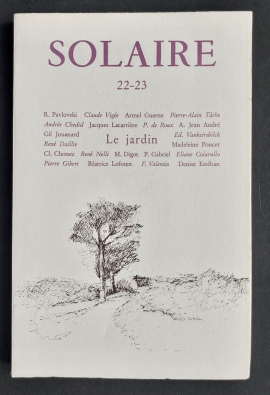 Revue de poésie active de mai 1973 à octobre 1983 en 31 numéros et 22 livraisons, animée par René Daillie, alors attaché culturel à l’Ambassade de France au Caire. «Solaire s’adresse à ceux pour qui la poésie ne saurait être une industrie comme une autre, ni un aspect de la linguistique expérimentale, mais d’abord un rapport de tous les instants avec la vie et l’univers, une raison.»