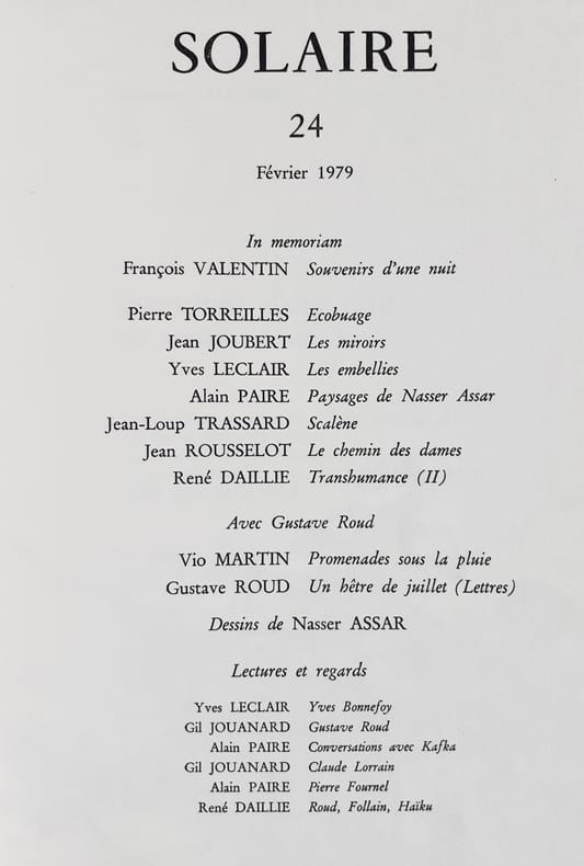 Revue de poésie active de mai 1973 à octobre 1983 en 31 numéros et 22 livraisons, animée par René Daillie, alors attaché culturel à l’Ambassade de France au Caire. «Solaire s’adresse à ceux pour qui la poésie ne saurait être une industrie comme une autre, ni un aspect de la linguistique expérimentale, mais d’abord un rapport de tous les instants avec la vie et l’univers, une raison.»