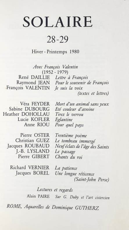 Revue de poésie active de mai 1973 à octobre 1983 en 31 numéros et 22 livraisons, animée par René Daillie, alors attaché culturel à l’Ambassade de France au Caire. «Solaire s’adresse à ceux pour qui la poésie ne saurait être une industrie comme une autre, ni un aspect de la linguistique expérimentale, mais d’abord un rapport de tous les instants avec la vie et l’univers, une raison.»