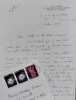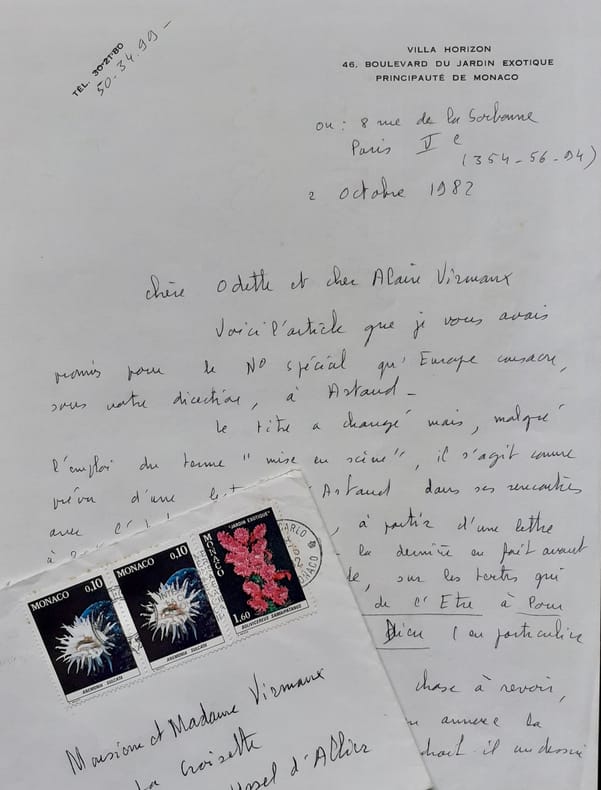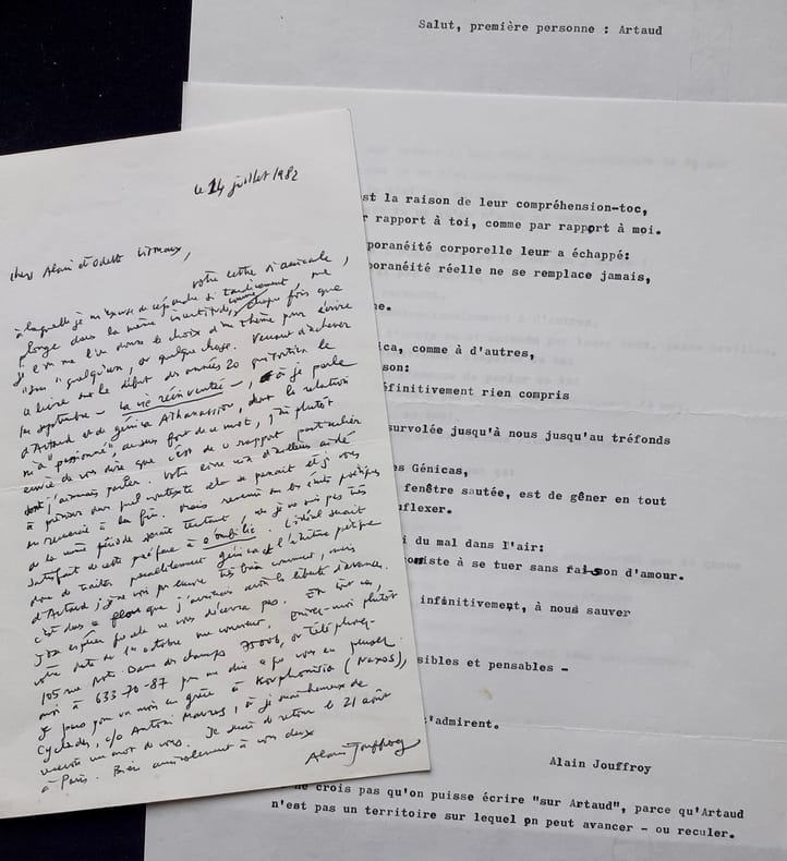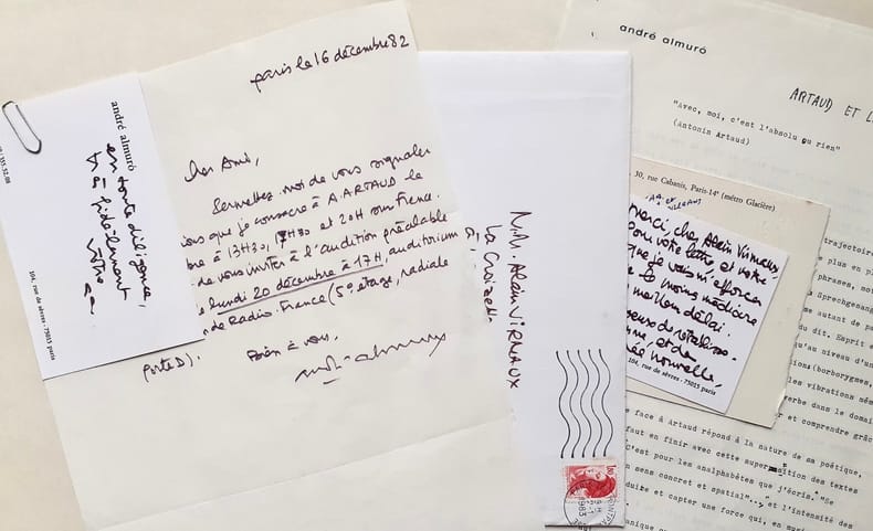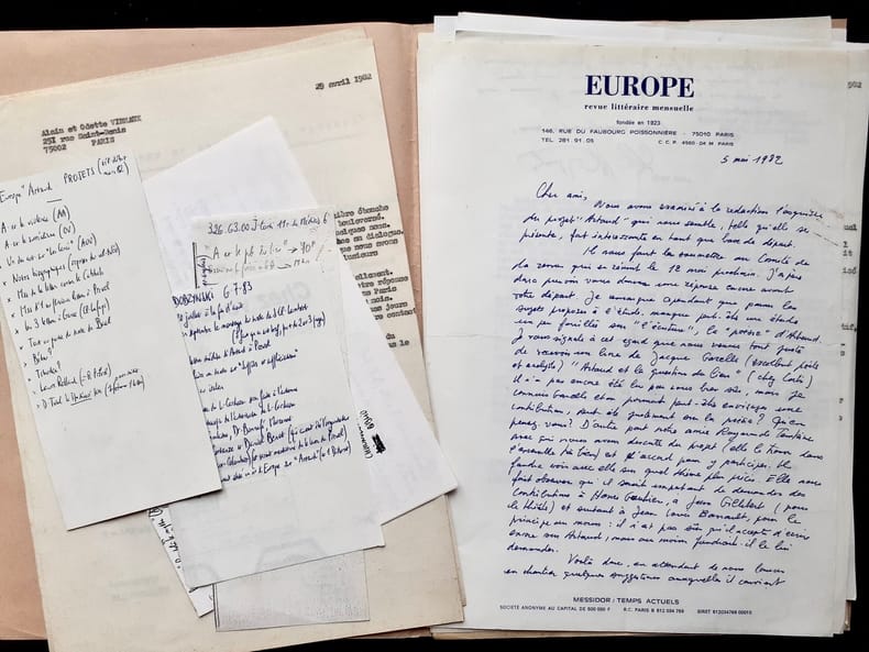 Important ensemble de documents tapuscrits et manuscrits réunis par Odette et Alain Virmaux, qui, en fins spécialistes d'Antonin Artaud dirigeaient ce second numéro d'Europe consacré au poète. Documents classés sous 20 chemises. 1. Correspondance et articles parus : Alain VIRMAUX : Une génération après. Manuscrit et tapuscrit corrigé - Laure ROLLAND (Rolande Prevel) : En compagnie d’Antonin Artaud. Tapuscrit corrigé par A. Virmaux - Yves BENOT : Crier sans fin. 2 lettres manuscrites signées et copie du manuscit de l’article. Réponse de A. Virmaux. Copie de l’article Entendre le cri d’Artaud, d’Yves Benot, paru dans La Pensée, n°188, août 1976 - Alain JOUFFROY : Salut, première personne : Artaud. Deux lettres manuscrites signées d’Alain Jouffroy avec réponses manuscrites et tapuscites des Virmaux - Odette VIRMAUX : Artaud et le Surréalisme. Tapuscrit corrigé - Alain VIRMAUX : Artaud et la violence. Tapuscrit corrigé - Jacques GARELLI : Les inventions d’Artaud. Tapuscrit corrigé et signé et 2 cartes manuscrites signées de J. Garelli avec réponses tapuscrites des Virmaux - Lothar BAIER : Lire Artaud, Notes sur une lecture obtuse. 4 lettres tapuscrites signées et tapuscrit corrigé par A. Virmaux. Réponse signée de A. Virmaux - Nicole GEBLESCO : Les Enfants de la mise en scène, principe. 2 lettres manuscrites signées et tapuscrit corrigé, daté et signé. Réponse signée de A. Virmaux - Umberto ARTIOLI : Production de «réalité» ou faim d’impossible ? 4 lettres tapuscrites signées. Tapuscrit et copie de l’article en français, tous deux portant des corrections. Réponses manuscrites et tapuscrites signées des Virmaux - Francesco BARTOLI : Le travail de la peinture. Deux tapuscrits de l’article traduit, corrigé par A. Virmaux. Copie de lettre tapuscrite de A. Virmaux, signée - Josep PALAU Y FABRE : Ci-gît et Guernica. Echange de correspondance : 8 lettres tapuscrites et manuscrites signées. Note manuscrite de Virmaux sur l’auteur. Joint copie de l’article Antonin Artaud, par Luis Cardoza Y Aragon, paru dans Plural, n°19, avril 1973 à Mexico - André ALMURO : Artaud et la musique. Tapuscrit de l’article corrigé et annoté. Une lettre signée et deux cartes manuscrites. Note manuscrite de A. Virmaux - Odette et Alain VIRMAUX : Chronologie bio-bibliographie - Un manuscrit de trois feuillets : Repères biographiques + 2 Tapuscrits du texte largement augmenté et corrigé. - Tapuscrit : Repères bio-biblio-theatro-filmographiques. - Tapuscrit : Parcours bibliographique. 2. Correspondance et projets d’articles, non publiés : Bettina KNAPP. 3 lettres manuscrites et 2 tapuscrites signées. Article tapuscrit corrigé : Le Mexique - Le mythe de la Renovatio. Lettres tapuscrites signées de A. Virmaux. Cet article n’a finalement pas été retenu pour le numéro d’Europe - Jean-Clarence LAMBERT. 3 lettres manuscrites signées. 1 tapuscrit : Tarahumara (3 feuillets) et 1 tapuscrit sur Luis Cardoza y Aragon (2 feuillets) et 6 lettres tapuscrites signées de Alain Virmaux - Sabine Robert ARON. 6 lettres manuscrites signées. Tapuscrit Robert Aron et le théâtre Alfred Jarry, corrigé. 5 lettres tapuscrites signées de A. Virmaux. Notes manuscrites de A. Virmaux et documents (copies) sur le théâtre Alfred Jarry - Jacques BAILLON. 3 lettres tapuscrites signées. 6 lettres tapuscrites signées de A. Virmaux. Doubles des lettres tapuscrites signées des VIRMAUX adressées à : J.M.J. Le Clezio, Michel de Grèce, Jean-Louis Barrault, Luis Cardoza y Aragon, Gérard Troussier, Célia Bertin (x2), Jacques Baron, Claude Lafaye (x2), Antoine Vitez (avec réponse tapuscrite signée du metteur en scène), Michel Carassou, Alvita Rojo, Rolande Ibrahim (épouse de Jacques Prevel), avec réponse manuscrite signée, Jean Dreville, avec réponse manuscrite signée, Robert Poulaille et Kenneth White. 3. Correspondance avec Charles Dobzynski, rédacteur en chef d’Europe - Alain VIRMAUX : 12 lettres tapuscrites signées - Charles DOBZYNSKI : 3 lettres manuscrites et 2 tapuscrite, signées.