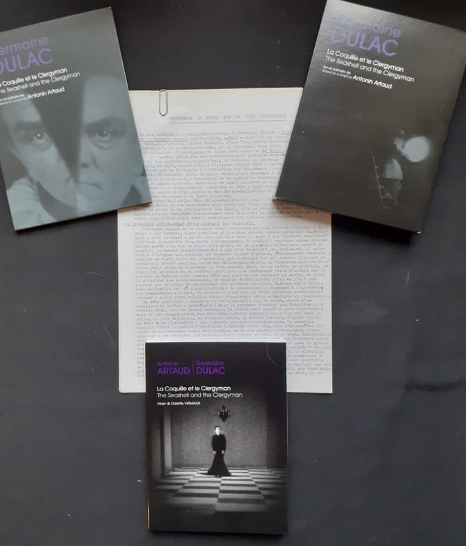 Paris : Light Cone / Paris Expérimental, 2009. Coffret comprenant un DVD comprenant le film La Coquille et le Clergyman (35mn), suivi de deux films conçus par Nicolas Droin et Prosper Hillairet : Surimpressions (33mn) : De la genèse du film à sa place dans l’histoire du cinéma et Tumultes aux Ursulines (15mn) sur la première mouvementée du film au Studio des Ursulines le 9 février 1928, où les Surréalistes, Breton et Aragon en tête, ont chahuté violemment la projection et le livre de Alain et Odette Virmaux de 158 pages illustré de planches hors texte. Textes en français et en anglais. Etat neuf. Joint le tapuscrit "Documents et notes sur un film controversé", par Alain Virmaux (7 feuillets recto seul).